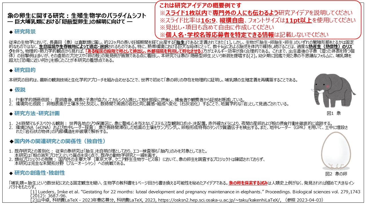 - 研究アイデア概要(スライド形式1枚以内、対応ファイル形式:jpg, jpeg, png, gif, pdf、ファイル容量:20MB以内)